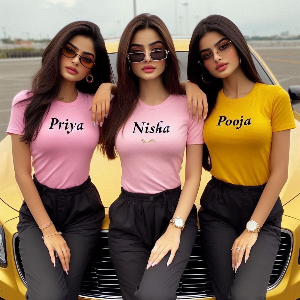 Three real indian 18 year old Indian girl friends are standing leaning against a golden super car, and all three are wearing different pink, yellow ,black shirts and black pants, white shoes, and all three have different names on their t-shirts.It is written”Priya, Nisha, Pooja” and the middle girls hand is on the Shoulders of both of them and all three have a watch, sunglasses, beautiful background view.