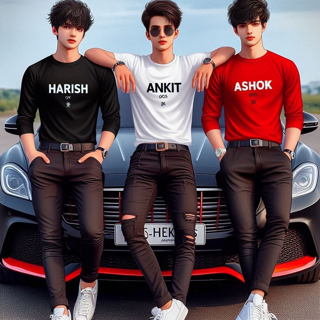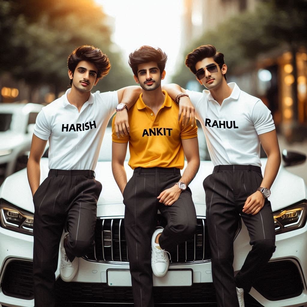 Three real 18 year old Indian Boys friends are standing leaning against a super luxury car, and all three are wearing different Black,white,red shirts and black pants, white shoes, and all three have different names on their t-shirts.It is written”Harish, Ankit, Ashok” and the middle boy hand is on the Shoulders of both of them and all three have a watch, sunglasses, make sure text should be correct, background is aesthetic.