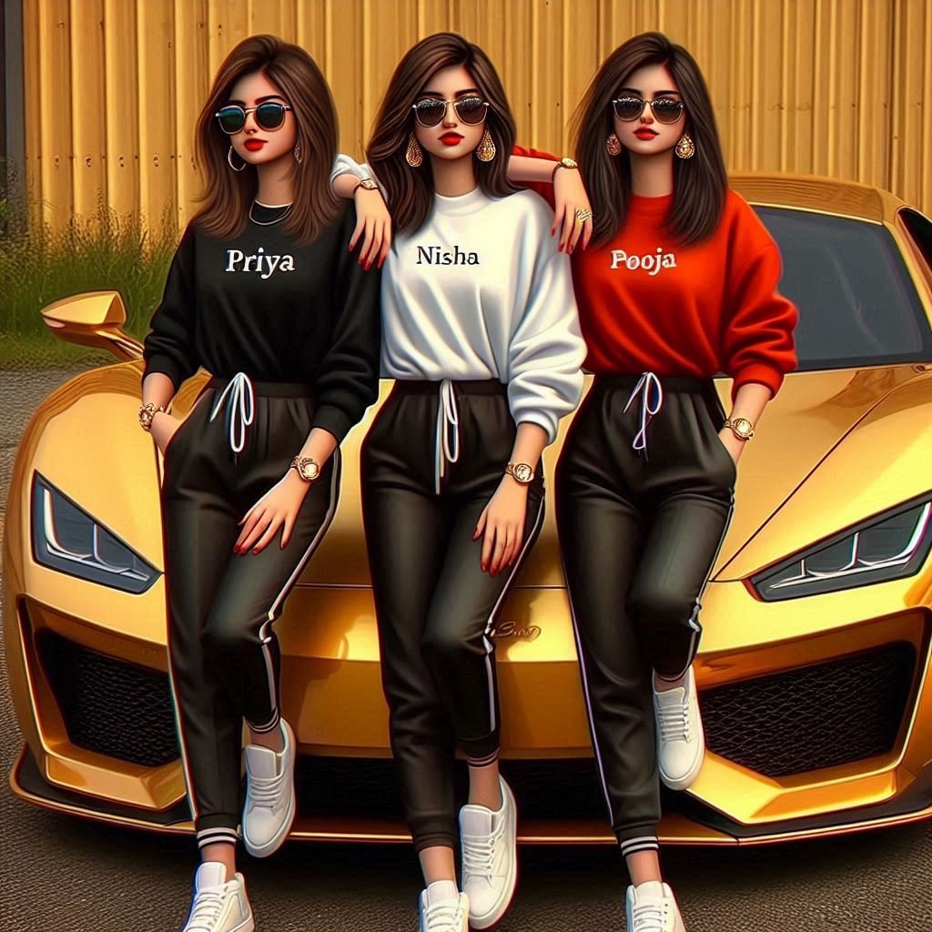 Three real 18 year old Indian girl friends are standing leaning against a golden super luxury car, and all three are wearing different Black,white,red shirts and black pants, white shoes, and all three have different names on their t-shirts.It is written”Priya, Nisha, Pooja” and the middle girls hand is on the Shoulders of both of them and all three have a watch, sunglasses,