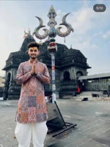 A young Indian man stands outdoors in front of an ancient stone temple. He is smiling softty and holding his hands together in a namaste gesture. His forehead is decorated with a bright yellow tilak and a thin red vertical line in the center. He is wearing a multicolored traditional kurta with patchwork-style pattems in shades of brown, peach, grey, and muted blue featuring floral and paisley designs. He pairs the kurta with loose white traditional pants Behind him stands a tall, decorated dhwaja-stambh (temple flagpole) painted with colorful artwork, including traditional symbols, deities, and omate paterns Above the pole is a large trident-shaped structure with three curved prongs, painted in vibrant shades of teal, gold, red, and white, featuring small hanging omaments. The temple in the background is built from dark grey stone with intricate carvings and arched windows, It has a distinct ancient architectural style with layered stone rools and sculpted detalls. The ground is made of stone tiles, with scattered flowers seen near the bottom area. The sky is soft and bright with a few scattered clouds, creating a setene and spiritual ambiance. The composition feels peaceful, devotional, and culturally