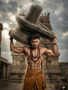 A powerful, muscular Indian man, resembling a warrior or a deity, with hair and a serious expression, is lifting or holding a large, heavy stone Shiva Lingam and its Yoni base. He is wearing saffron/ochre colored traditional Indian lower garment (dhoti). The scene is set amidst the ruins of an ancient, grand South Indian temple complex (like a Dravidian Gopuram or Vimana structure) under a dramatic, cloudy sky. Cinematic, epic fantasy style, hyper-detailed, dramatic lighting. 100% matching my face