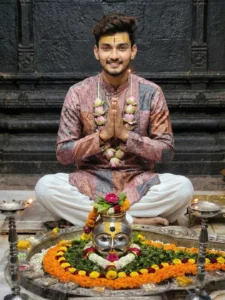 A young Indian man sits cross-legged insade a dark stone temple, posing for a devotional photograph. He is smiling so and holding his hands in a “nanmaste” gesture. His forehead is decorated with bright yellow tilak and red kumkum. He wears a multicolored ethnic kurta with patchwork-style patterns in shades of pink, peach, and blue, along with w106 traditonal pajama pants, Around his neck is a garland made of pink lotus buds.in front of him is an omate silver pooja thali placed on the floor. At the center is a shining silver kalash with an engraved human-like lace, decorated with a leaf crown, a red rose on top, and expressive black eyes. The base of the kalash is surrounded by elaborate floral rangoli made. orange mangold, white mogra, red roses, and green leaves arranged neatly in circular patterns. Several small silver pooja items, coins, and offerings are placed around the thali. Two large silver oil lamps are positioned symmetrically on both si of the frame with sott warm flames glowing. The background consists of an old, textured black stone temple wall with Intricate carvings and dim ambient lighting, creating a sacred and serene atmosphere. The overall mood is peaceful, and traditional