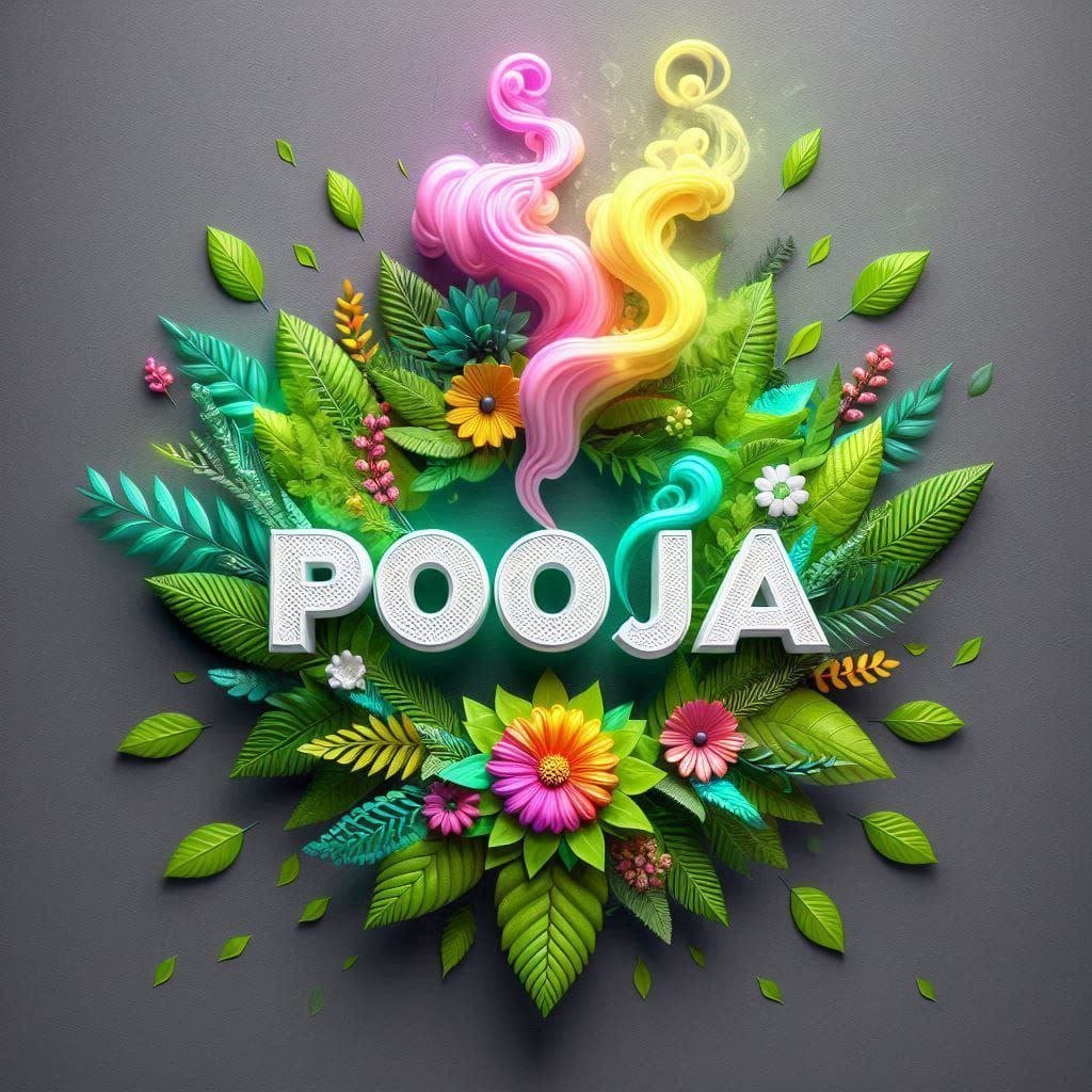.A decorative wreath made of vibrant green leaves and flowers encircles the word POOJA in textured white bold neon letters. Above the wreath, colorful puffs of pink, yellow, and green smoke emerge, while scattered leaves surround the composition on a gray background.