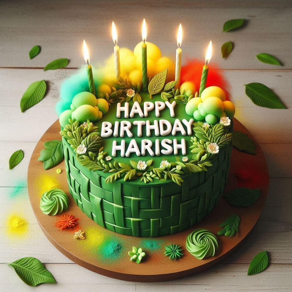 A green birthday cake with a basket-weave pattern sits on a wooden surface, adorned with four lit candles. Above the cake, the words Happy Birthday Harish are written in white letters, surrounded by green leaves and colorful clouds of yellow, red, and green powder.
