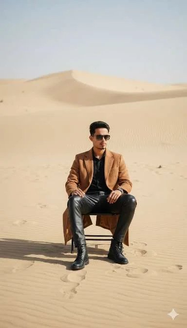 Please create an image using my photo, which features an attractive editorial portrait of a handsome young man in a long, camel-brown overcoat and black leather pants/boots, sitting on a black folding chair in the middle of a vast, bright desert with large sand dunes. Harsh, natural light. Fashion photography, high quality, cinematic.”