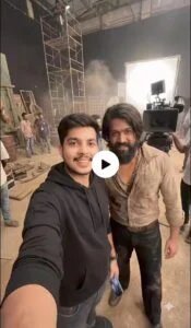 The boy takes a selfie and walks off to the next set smiling, vlogging in excitement as he grabs the camera which locks onto his face, and takes a selfie again. The crew is working on the set in the background. No conversation. copy to clipboard