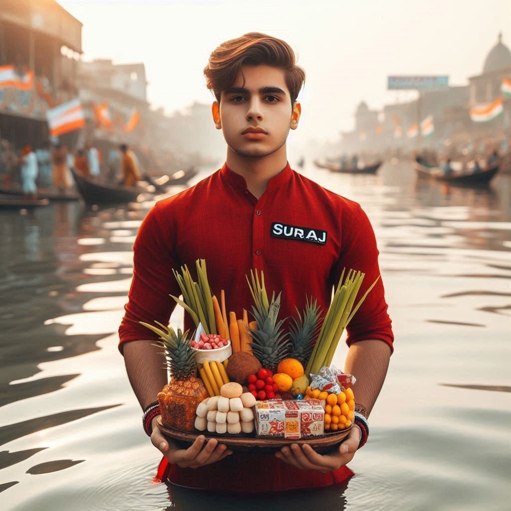 A real 20 year old Indian boy is standing in the water and is holding small sugarcanes, various fruits and sweets in a Supli, the boy is wearing a red kurta with the name “Suraj” clearly written on it black latter, It has happened, there is an environment of Chhath Puja with the ghats being decorated. Beautifully, “Happy Chhath” should be written clearly in background, real image, 4k ultra HD quality,