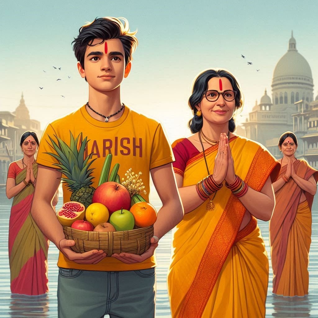 A 16 year old boy standing in the big bankriver and next to him a indan motherstanding on the big bank river and holding adecorated bamboo basket pomegranate.banana, apple, little sugarcane, orange, theboy folded your hand praying. the boy iswearing a yellow T-shirt "Harish" written on it.indian mother wearing yellow saree and red. background features some women folded your hands and praying. he is looking good boy and Happy Chhat pooja  Write at top sky in the back