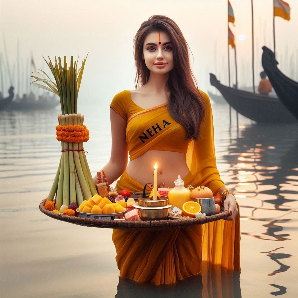 Standing in the water with a Supli filled with little sugarcane, fruits, and sweets is a real 20-year-old Indian girl. She is dressed in a yellow Indian saree with the name "Neha" printed in black letters. It has occurred; the ghats are decked, creating a Chhath Puja ambiance. "Happy Chhath" should be beautifully written in the background with a real image and 4K ultra HD resolution.