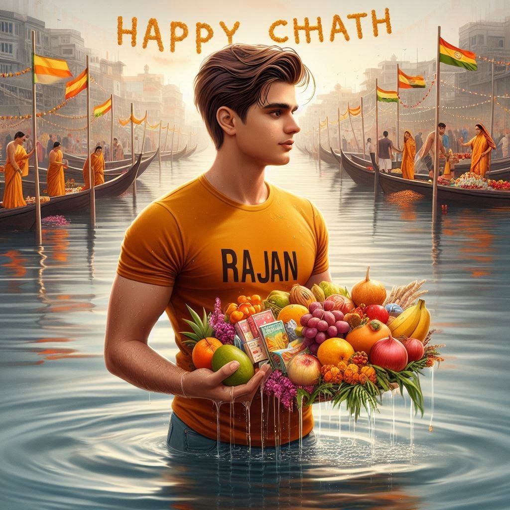 produce a realistic, high-quality image of a 20-year-old boy standing in water with a variety of fruits and sweets in his hand. The boy is wearing a saffron t-shirt with the name "RAJAN" written boldly on it. The scene is of a chhath puja, with the ghat beautifully decorated, and the words "HAPPY CHHATH" written in large letters in the background sky. The boy's name must be clearly and accurately visible.