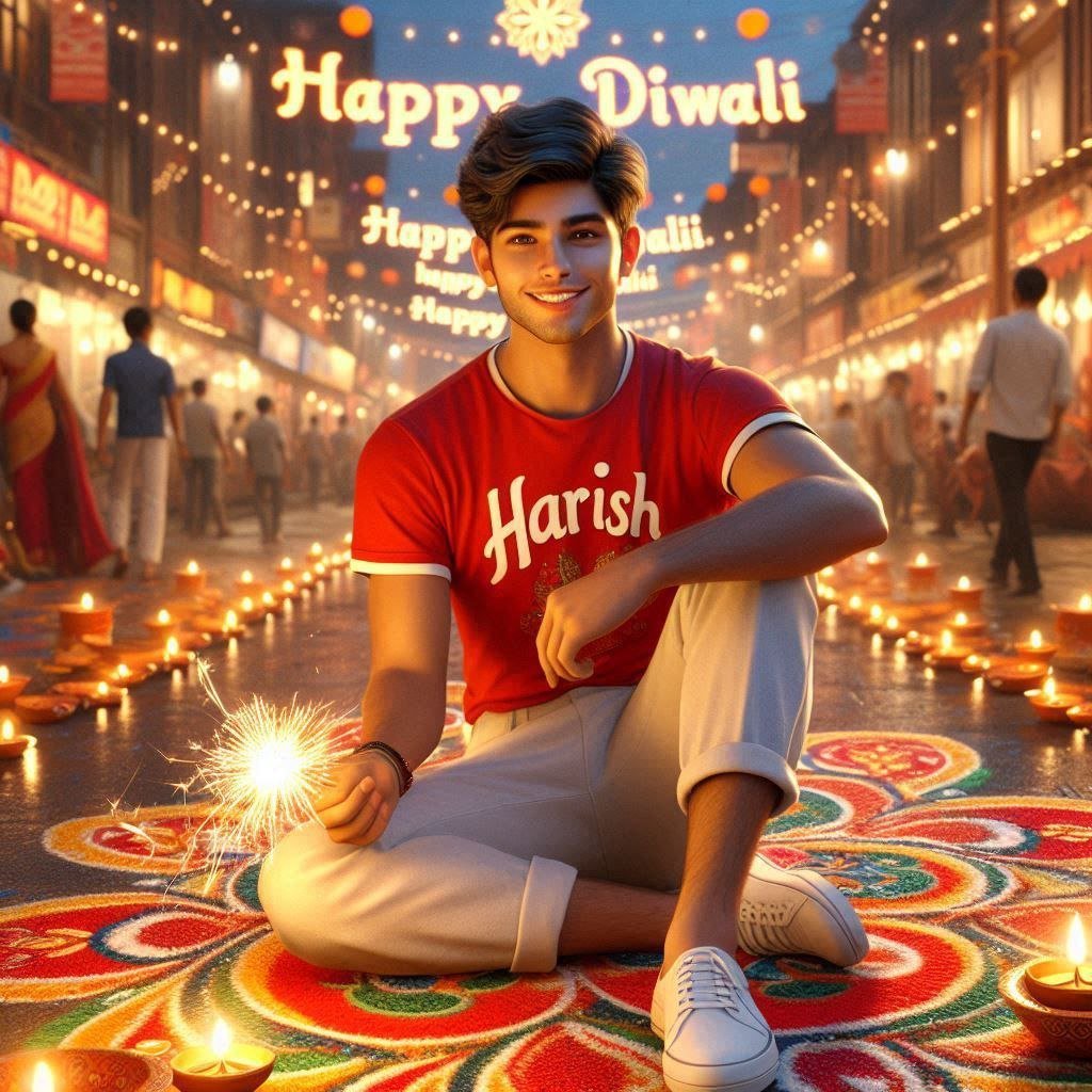 "A realistic portrait of an 18-year-old Indian boy celebrating Diwali on an Indian street. He's wearing a bright red t-shirt with Harish written on it in white letters, paired with crisp white pants. He is smiling and holding a lit sparkler. The bustling street is decorated with colorful lights and rangoli patterns. In the background, 'Happy Diwali' is written in glowing, ornate letters formed by diya lamps. The scene is filled with warm, festive lighting from vario
