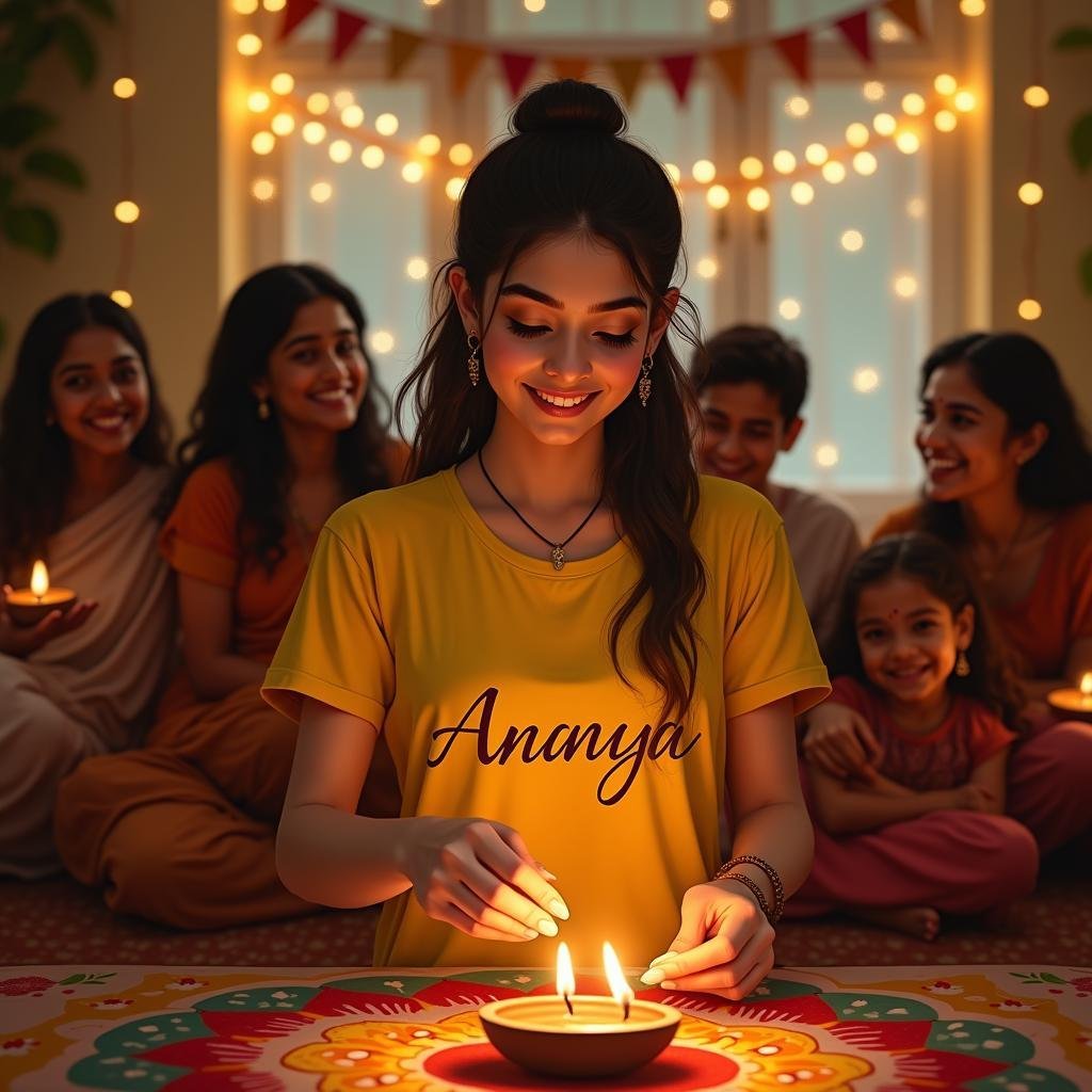 "Realistic portrait of 23-year-old Indian woman Ananya, wearing a fitted yellow t-shirt with 'Ananya' in elegant script. She's lighting diyas with her family in their warmly lit living room. Colorful rangoli on floor, 'Happy Diwali' banner hanging. Festive atmosphere with smiling relatives, twinkling lights, and traditional decorations."