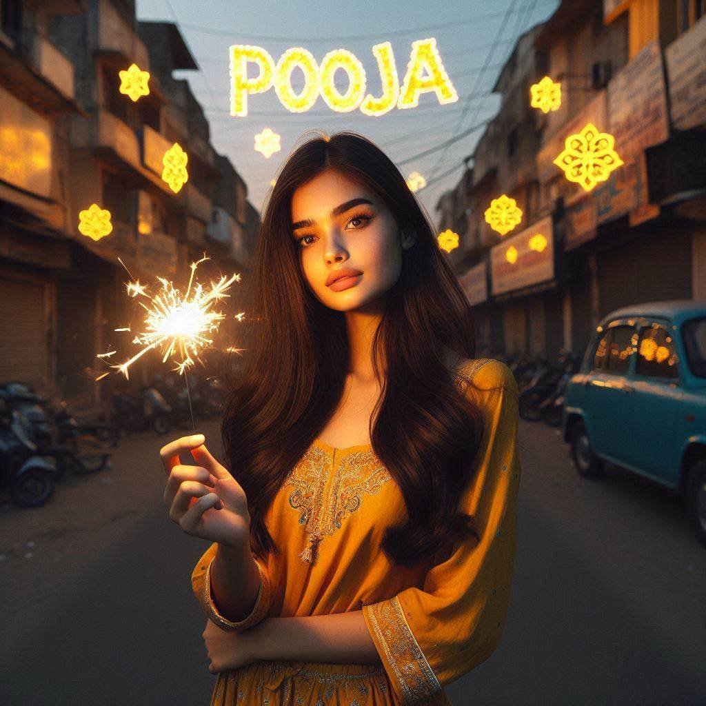 a real 18 year old indian girl with sparklers in her hand standing at the indian street. girl wearing yellow dress and pajama, girl's name "Pooja" is written on sky with glowing letters at night, diwali festival, 8k realistic image