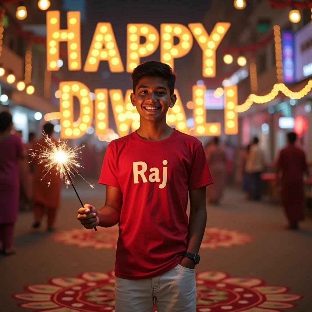 "A realistic portrait of an 18-year-old Indian boy named Raj celebrating Diwali on an Indian street. He's wearing a bright red t-shirt with 'Raj' written on it in white letters, paired with crisp white pants. Raj is smiling and holding a lit sparkler. The bustling street is decorated with colorful lights and rangoli patterns. In the background, 'Happy Diwali' is written in glowing, ornate letters formed by diya lamps. The scene is filled with warm, festive lighting from various Diwali decorations, creating a joyful and authentic atmosphere."