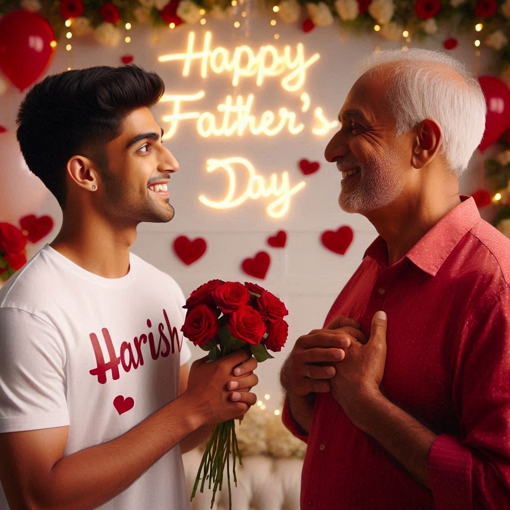 18 years old boy proposing to 45 year old Man, with red roses's. boy wearing White t-shirt with name "Harish" write on back. father Red shirt and looking so handsome, indian, smile experience. "HAPPY FATHER'S DAY" written in neon light bold font on white wall. Wall decorated beautiful flowers lights, balloons and father day decorations. High quality 4k picture, make text should be visible.