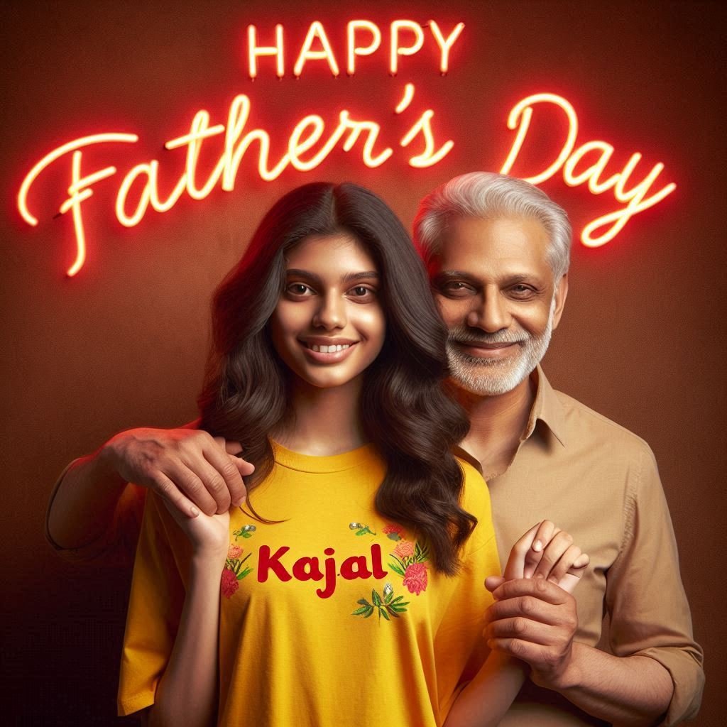 Create a realistic picture of an 18-year-old Indian girl holding her father's hand. Both look happy. The girl is wearing a "Yellow" T-shirt. The T-shirt has the girl's name "Kajal" written on it and Happy Father's Day written in big and bold red neon light font on the brown wall