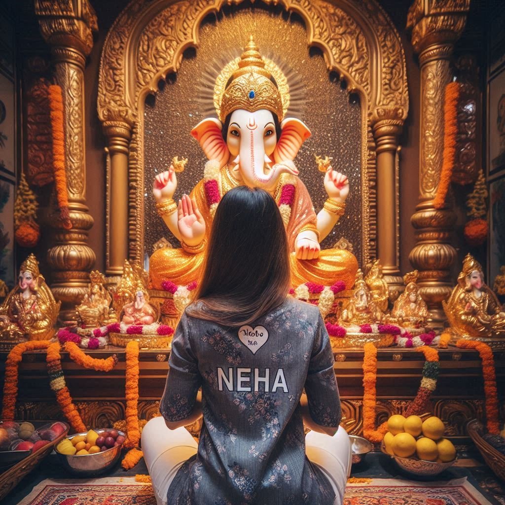 Girl has her back to the viewer , joining her hands and she is dressed in devotional with the name "Neha" printed on it. The surroundings are adorned with golden decorations and offerings of fruits.The atmosphere is serene and reverent, the essence of devotion and make sure name must be visible .