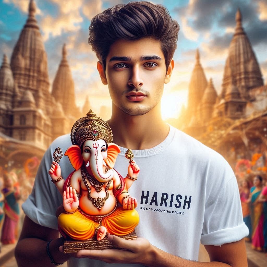 Create a Realistic Picture of A 20 year Old Indian Boy Holding a Small Size Lord Ganesh statue in his hand. In Public. “Harish” Clearly is written in boy Tshirt and beautiful background Divine. Boy looking so handsome, HDR. above sky "Happy Ganesh Chaturthi " written in bold letters,make sure text should be correct.