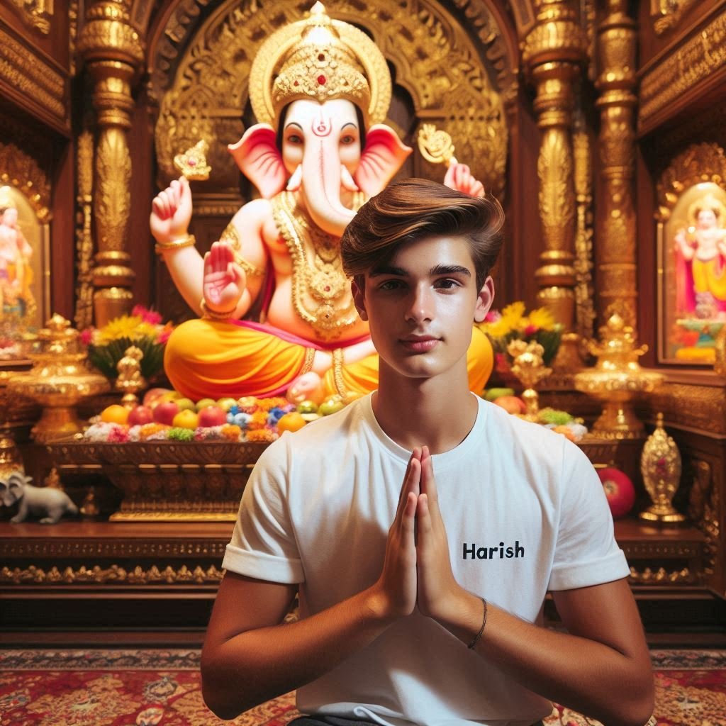 18 years old boy sit in front of a beautifully decorated idol of Lord Ganesha, placed in traditional temple setting. The boy has his face to the viewer , joining his hands and is wearing a white t-shirt with the name "Harish" printed on it. The surroundings are adorned with golden decorations and offerings of fruits.The atmosphere is serene and reverent, the essence of devotion and make sure name must be visible .