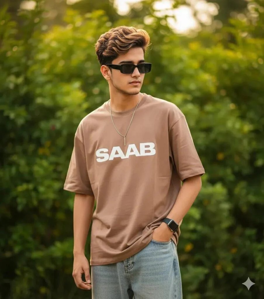 create image. A stylish young man with messy volume hair, posing outdoors in a vibrant natural setting. He's wearing an oversized light brown T-shirt withand a 'SAAB' logo, buggy jeans, rimless rectangular black sunglasses, a vertical bar pendant, and a black Apple Watch. The background is lush, softly blurred greenery with cinematic lighting, creating an ultra-realistic 8K DSLR-quality image