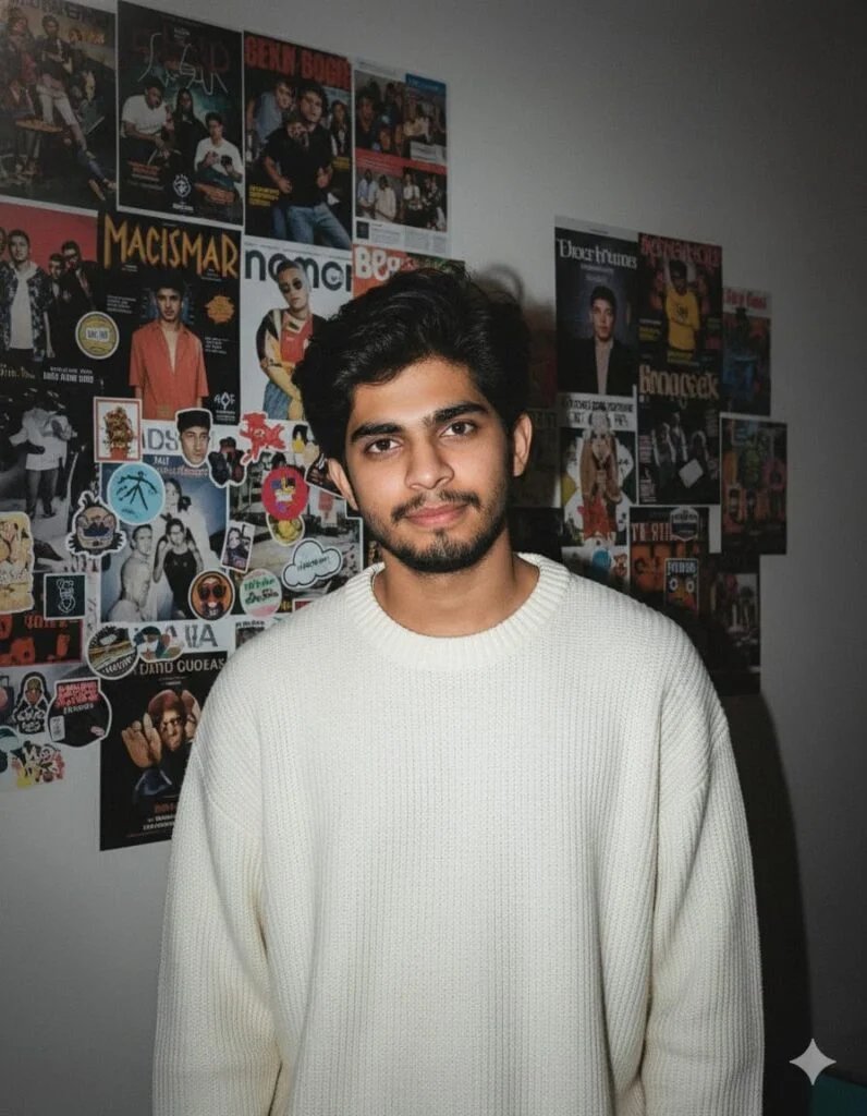 Without changing his original face, create a portrait ofa beautiful young man, captured with a 1990s-stylecamera using a direct front flash. His messy darkbrown hair, posing with a calm yet playful smile. hewears a modern oversized cream sweater. Thebackground is a dark white wall covered withaesthetic magazine posters and stickers, evoking acozy bedroom or personal room atmosphere underdim lighting.
