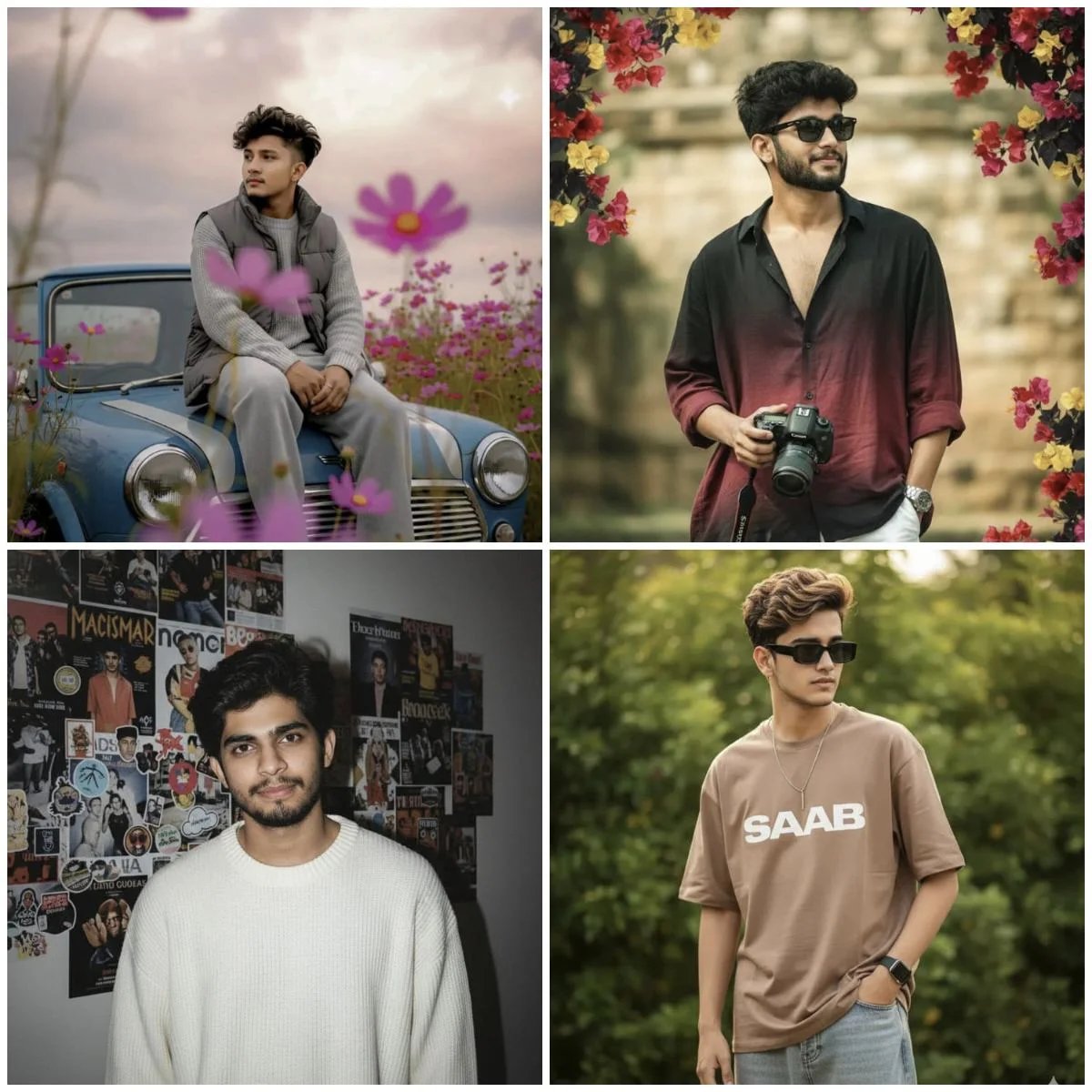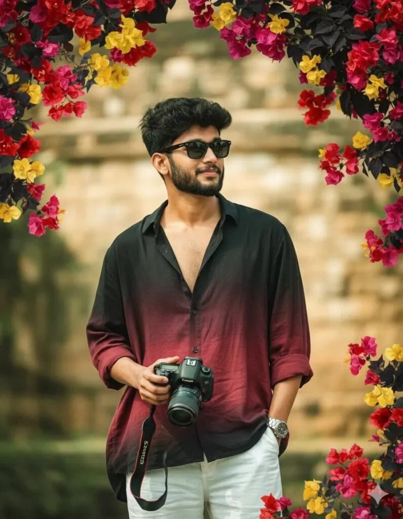Creat a 8k hyper-realistic dark green portrait cinematic image with dramatic smile actions.(uploaded photo 100% face match) of A stylish handsome young man (refrence image given) with a slightly dark messy hairstyle and wearing a lose black & maroon gradient half lineing shirt and white lose pant. He hold a Canon camera, He is looking thoughtfully off-camera, captured in a candid, high-key cinematic outdoor portrait The composition is framed by a branch of vivid red/pink/yellow/black