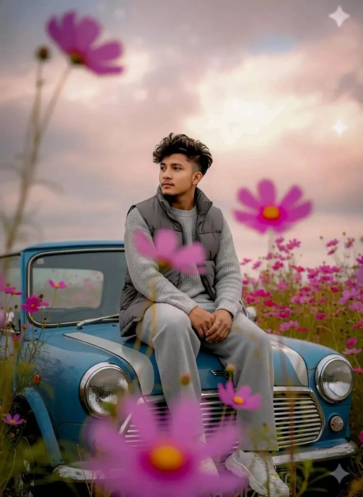 Ultra-realistic editorial close-up portrait, vertical 9:16. Scene: A young man (use uploaded image as face reference) sits relaxed on the hood of an old, faded-blue Mini Cooper. The frame captures him from the waist up, with the car’s curved hood and chrome details subtly visible in front. Surrounding him are tall pink–magenta wildflowers, some close to the lens and softly blurred to create a dreamy bokeh veil and parallax depth. Behind the car, dense paste