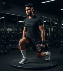 Use the attached photo and maintain 100% fusal accuracy keep the exact face structure, hairstyle, beard, skin tone, and expression from the reference lanage Create a photo-realistic gym scene featuring the same man from the attached photo, depicted as a muscalar, athletic man in his late 20s, performing a dumb bell lunge exercise.He has a short, faded haircut and a focused, determined expresalon. He is wearing a black fitted t-shirt, black athletic shurts, schite Nike socks, and modern gray and white training shoes. His hands grip a pair of heavy black dumbbells. and he is wearing black wrist wragis for support The man is positioned on a round, black platform, placed slightis off-center to the right, wille facing toward the left and downward, showing his concentration and balance. The camera perspective is medium angie, capturing his entire upper and lower body to emphasize his muscular form and perfect workout posture The background shows a dark gym interior with rows of dumbbells, weight racks and subtle reflectious on gym mirrors. A blurved figure is faintly visible in the distance to suggest a real, active environment. The lighting is strong, directional, and dramatic, coming from the left side, high lighting the definition of muscles, contours, and texture of the skin and clothing Shadows fall naturally to the right, adding depth and intensity. Fusure the face remains identical to the attached photo – maintaining realistic likeness, emotion, and skin tone without any distortion. The overall style should be cinematic, crisp, and motivational, evoking the energy and focus of a professional fitness photoshoot,