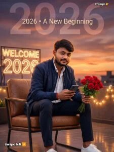 modern chair while holding a smartphone in one hand and a bouquet of fresh red roses in the other. The subject has neatly styled wavy black hair, smooth glowing skin, and a natural confident expression.He is wearing a clean, fitted, premium outfit – a stylish Jacket or hoodie, perfectly arranged clothing, dark fitted trousers, and spotless white sneakers. His posture is relaxed yet powerful, giving a modern hero-like vibe. Background features a beautifully decorated rooftop with neon lights displaying ‘WELCOME 2026’, soft fairy lights, colorful flowers, and a warm sunset sky with cinematic gradients. Add soft rim light, deep shadows, buttery-smooth depth of field, bokeh highlights, HDR lighting, high contrast, ultra-sharp detailing, and realistic reflections on the floor. Add a subtle motivational poster feel: large sof
