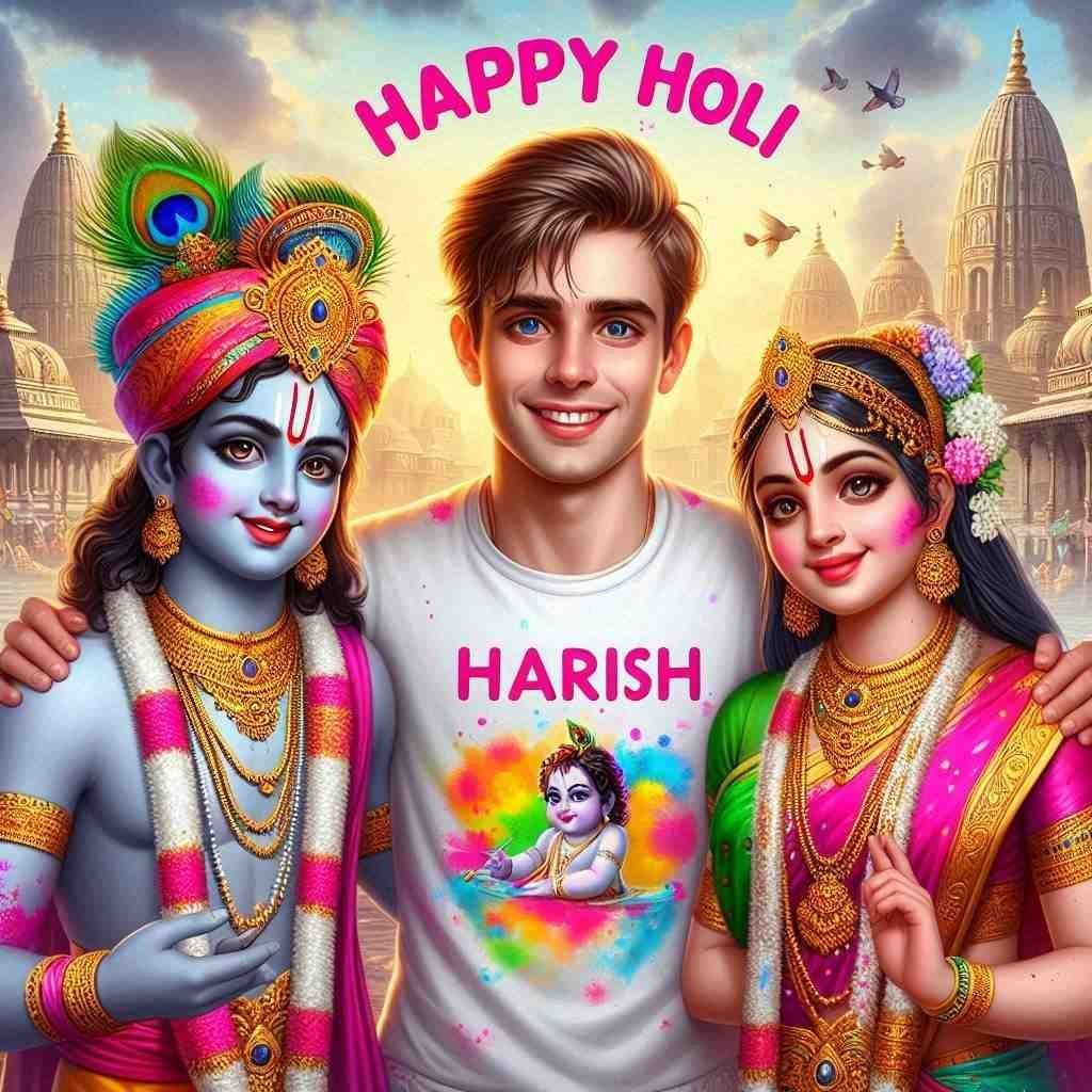 Create a realistic image in which, a realistic 20 year old boy with Lord Krishna and Radha wearing a colorful white T-shirt with his name Harish" is written on T-shirt, they are smiling ,The environment is colorful, the background features with hindu temples, Make sure text must be visible. the words "Happy Holi" is Written at top sky with bold letters.