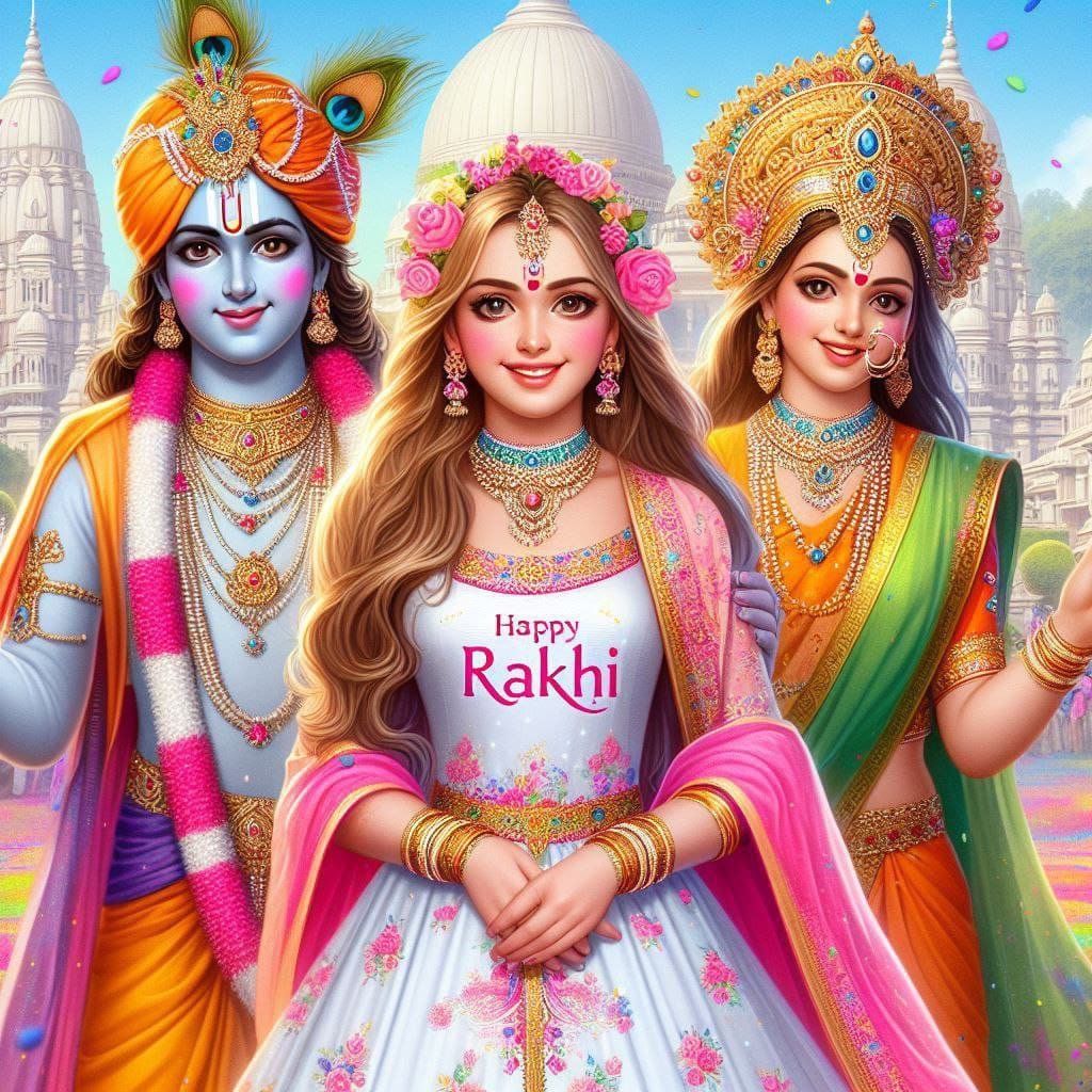 Create a realistic image in which, a realistic 20 year old Girl with Lord Krishna and Radha wearing a colorful white Gown with her name "Rakhi" is written on Gown, they are smiling ,The environment is colorful, the background features with Hindu temples, Make sure text must be visible. the words "Happy Holi" is Written at top sky with bold letters.