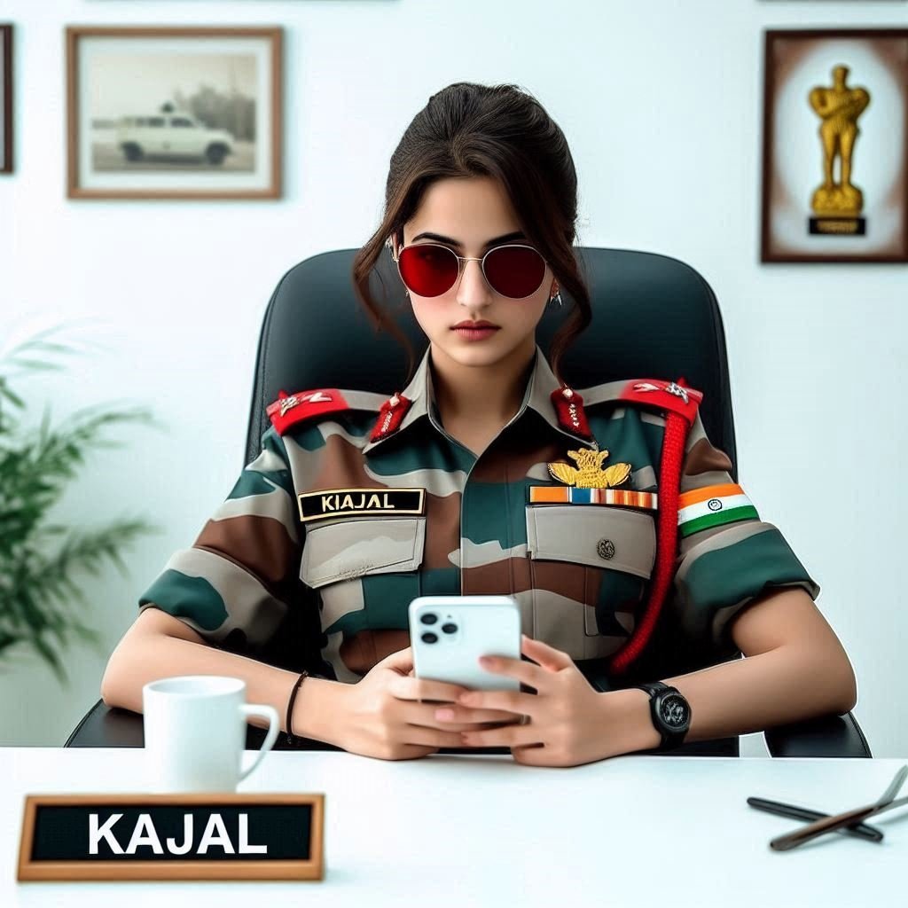 a reality beautiful profile pic 20 year girl Indian Army uniform with dark Red sunglasses wearing i phone & in A chair office sitting white table with name plate "Kajal" army decorations and background wall white features Indian army handsome girl,