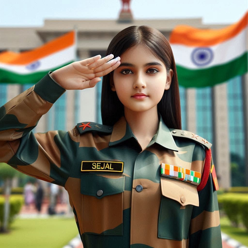 A 20 years old girl Wearing Indian Army Uniform And Salute his Country India Flag and the name written on his Uniform is "Sejal" in beautiful fonts and she is standing behind her Country Army Head office