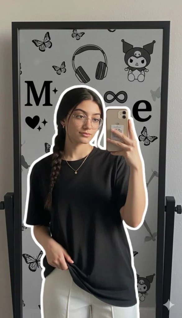 "A young girl with a realistic face taking a mirror selfie, wearing a black loose shirt and white pants, holding the shirt casually with one hand, minimal jewelry, with the same hair and realistic lighting. There's a soft white outline glow around her. The background is a modern grayscale aesthetic collage with elements like black butterflies, the letters 'M' and 'e', headphones, a black heart with sparkles, an infinity symbol, and a Kuromi plush toy. The overall style is an artistic, trendy Instagram-style edit with balanced composition and HD quality, maintaining the same proportions and face."