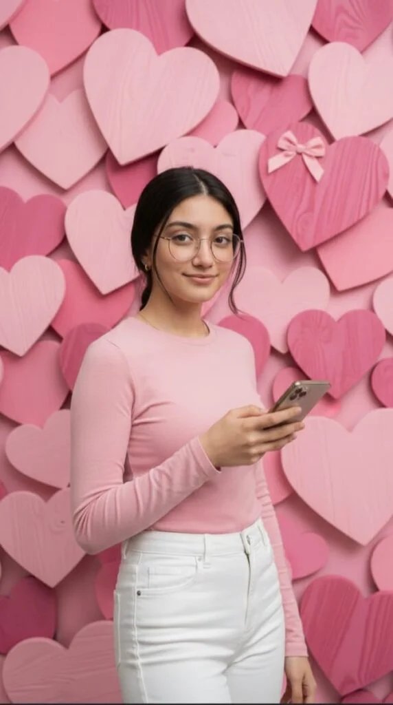"create image of A young woman in a pink shirt and white pants, holding a phone, standing in front of a background of various pink heart shapes with a wood grain texture. One of the hearts has a small pink bow."Face should exactly same as given image.