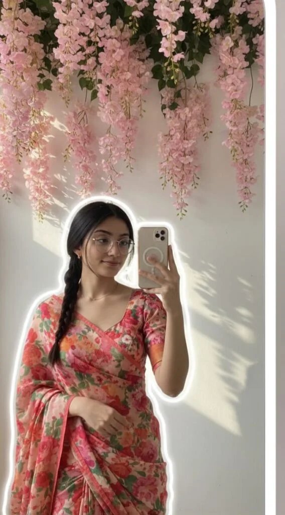 A young girl with a realistic face taking a mirror selfie, wearing a vibrant floral saree and blouse, holding the phone casually with one hand, minimal jewelry, with the same hair and realistic lighting. There's a soft white outline glow around her. The background features pink cascading flowers and green leaves against a white wall with dappled sunlight. The overall style is an artistic, trendy Instagram-style edit with balanced composition and HD quality, maintaining the same proportions and face."