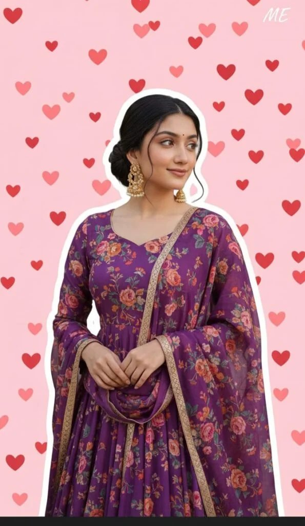 A beautiful young Indian woman (half body)with her hair styled in a bun, wearing elegant golden earrings, and a flowing purple floral print Anarkali suit with a dupatta. She is smiling and looking to the side. Style: The woman has a prominent white outline border around her body, giving her a sticker-like or cutout appearance. The background is a solid light pink color, filled with numerous red and darker pink heart shapes of varying sizes, scattered randomly. There's also some subtle white text "ME" in a handwritten style on the top right. High-quality, aesthetic fashion photography."