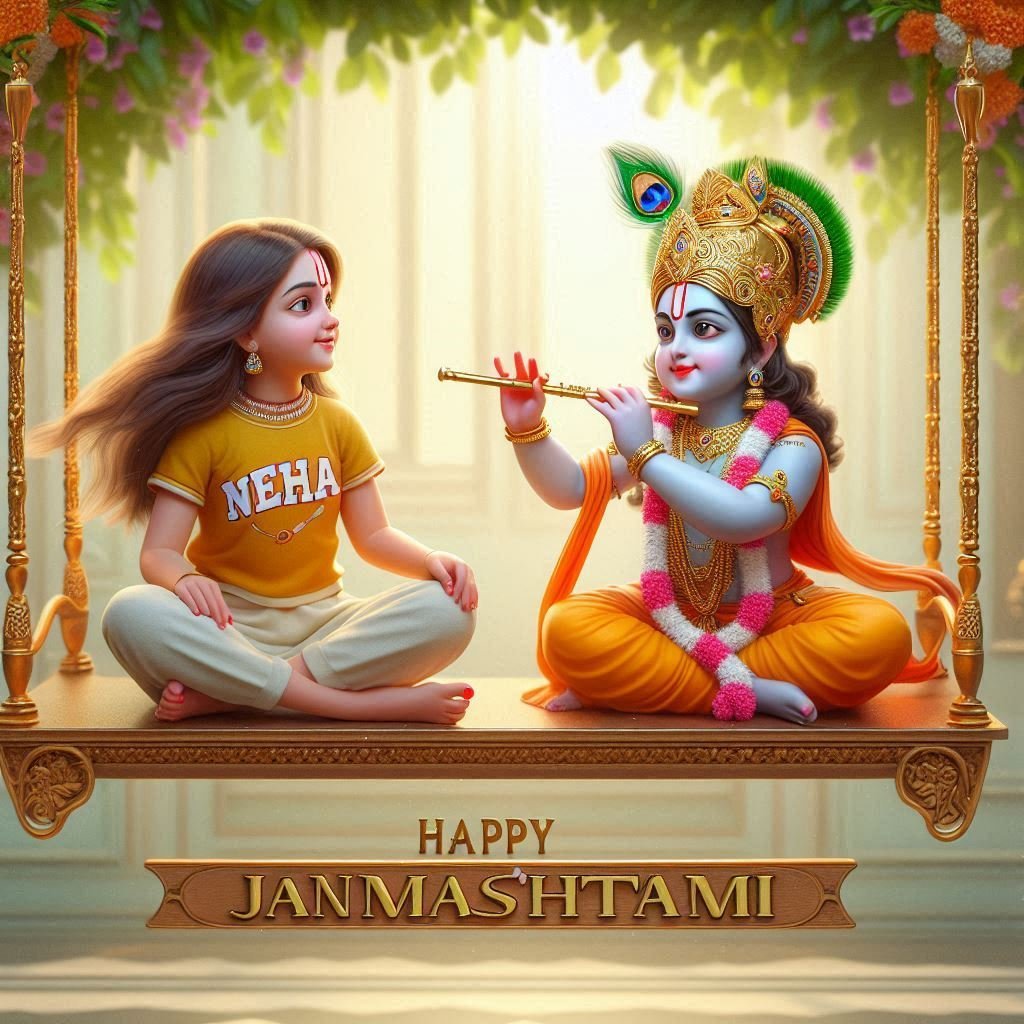 create a 3D realistic picture "A Girl is worshiping Shree Krishna and Shree krishna is sitting on a swing and playing flute and "Neha" is written on the girl's t-shirts and the girl is worshiping and in the background "Happy Janmashtami" is written in bold font clearly, make sure everything should be correct