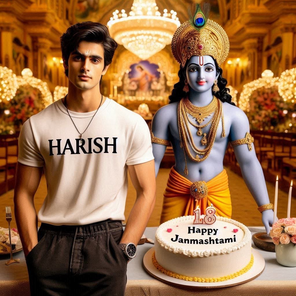 A real image shows Lord Krishna cuttings a birthday round cake on the table which has "Happy Janmashtami" clearly written in big letters, and standing next to him is a real 18-year-old boy wearing like a white T-shirt which has "Harish" clearly written on it, the boy is wearing a watch bracelets, stylish black hair, the two are in a love temple, the temple is decorated with beautiful lights and balloons.