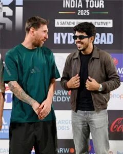 A hyper-realistic, candid press photograph capturing Lionel Messi and the young man from image_10.png together on a stage. On the left, Lionel Messi wears his dark teal Adidas t-shirt and black shorts, his tattooed right arm visible, looking towards the young man. On the right stands the young man from image_10.png, wearing his black t-shirt, unzipped brown jacket, grey jeans, and sunglasses, smiling as he holds the lapels of his jacket and looks back at Messi. The background is the “INDIA TOUR 2025 HYDERABAD” media wall with sponsor logos, exactly as seen in image_8.png and image_11.png. The lighting is bright and professional, characteristic of a press event. The photo is high-resolution, sharp, and captures a genuine moment between the two individuals, image ratio – 3:4 instagram post size.