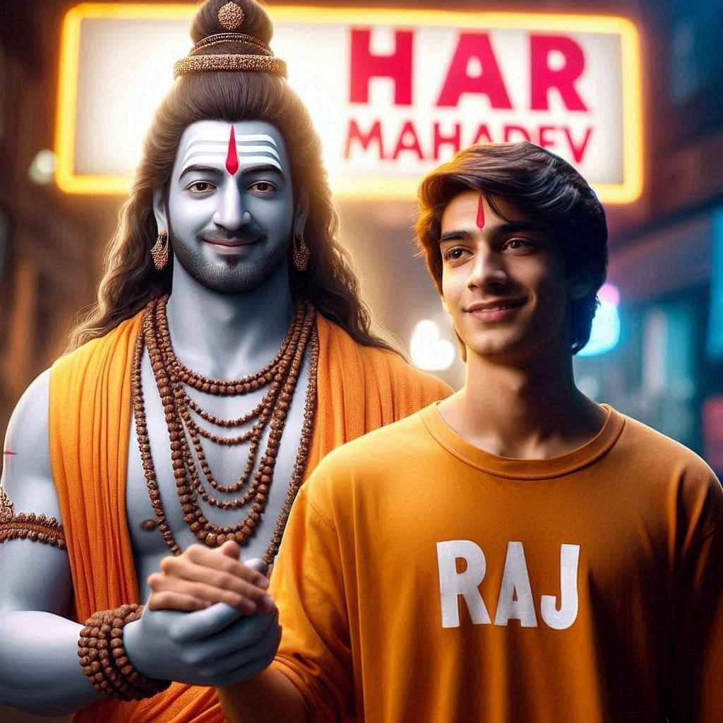 Create an illusion the 25 year old boy closeup of lord Mahadev holding hand walking with a 20 year old boy wearing a saffron tshirt written name ” Raj ” Big and capital font. both smiling. Background neon labels proudly display the caption ” Har Har Mahadev ” , soft light reflection