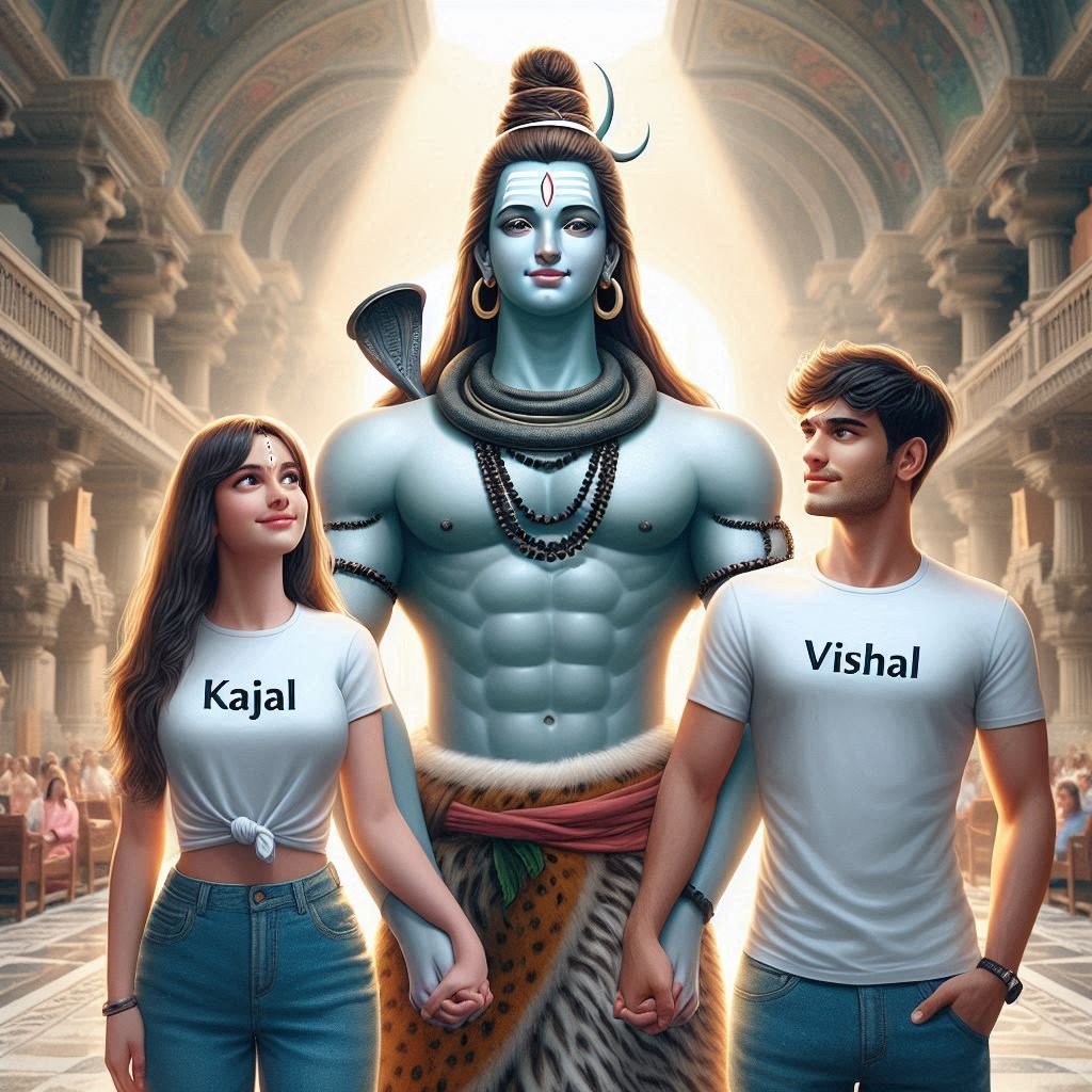 Create a high quality realistic image, in which lord shiva is holding hands of a 20 year old boy and 18 year old girl, both are wearing plain white thsirts with name of girl ‘Kajal’ and name of boy ‘Vishal’ written boldly on their top, both are watching towards lord shiva with little smile, all three are standing with lord shiva in middle , the background is of interior of a temple and the environment is gorgeous.