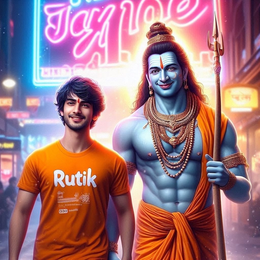 Create an hyper realistic image of 26 year old boy closeup of lord Mahadev holding hand walking with a 20 year old boy wearing a saffron tshirt written name ” Rutik” Big and capital font. both smiling. Background neon labels proudly display the caption ” Jay Bhole ” , soft light reflection