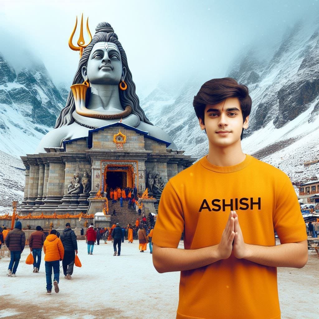 18 year old indian boy is standing with folded two hand with at the Kedarnath temple. The lord shiva image in low opacity on mountain. A boy wearing saffron t-shirt & pent and name Akhilesh' write in bold font on T-shirt. He is looking very cute, Lord shiva tilak Deccan on your head. Very realistic pictures,real kedarnath template, snow fall moment, snow falling, beautiful mountains, many peoples, very clear pictures, Make sure Boy's Name must be correct and visible.
