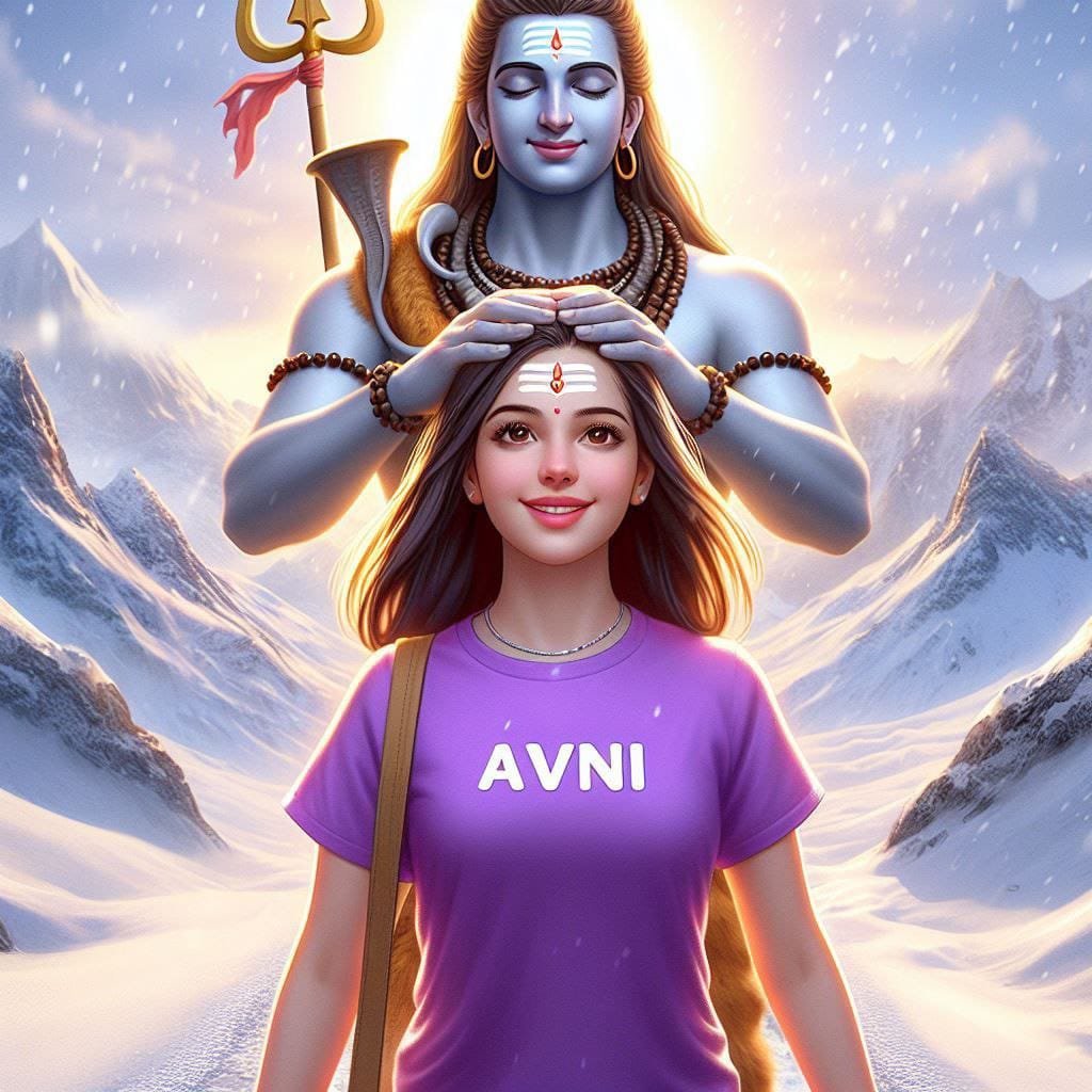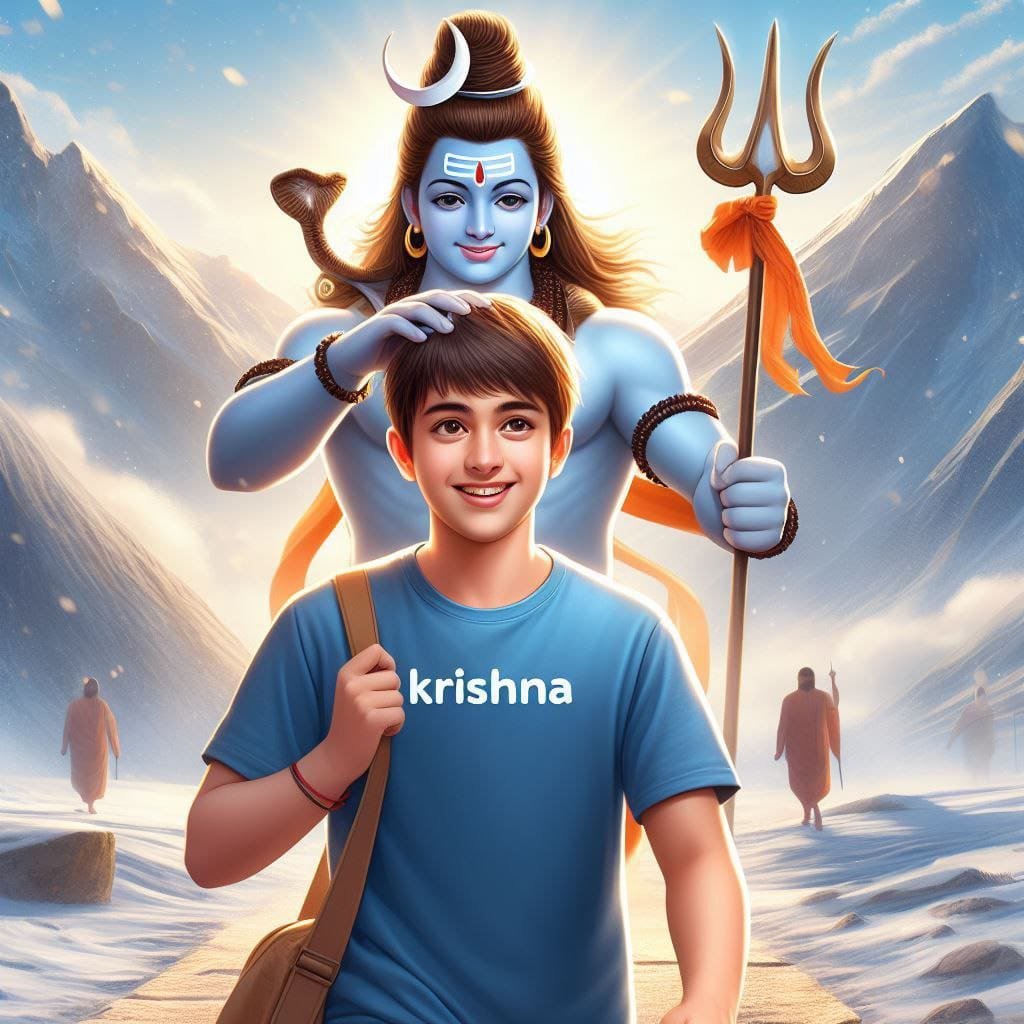 18 years old boy walking and lord mahadev coming after him and Mahadev's hand putting on Boy head on mountains. Both are smiling. boy is wearing blue t-shirt and name Anshul" write on it with bold. he looks very realistic, cute, shiva tilak Deccan on your head, and happy. very realistic pictures, high quality picture, realistic mountain, snowfall moment.sun lights reflection in back. and "happy mahashivratri" write at top. make sure text must be correct.