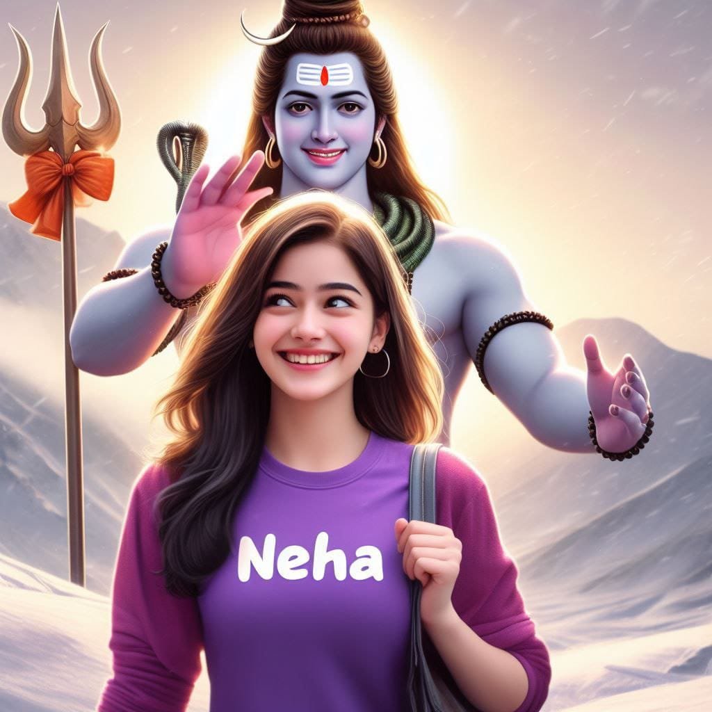 18 years old Girl walking and lord mahadev coming after him and Mahadev's hand putting on girl head on mountains. Both are smiling. Girl is wearing pink t-shirt and name Pallavi write on it with bold. she looks very realistic, cute, shiva tilak Deccan on your head, and happy. very realistic pictures, high quality picture, realistic mountain, snowfall moment.sun lights reflection in back. and "happy mahashivratri" write at top. make sure text should be correct.