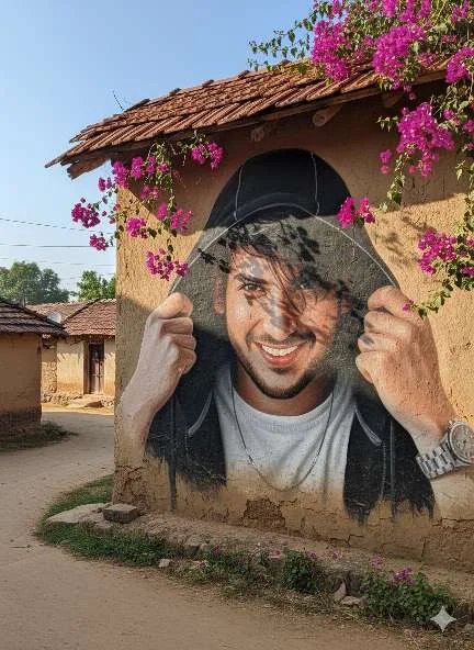 Wall painting effect Bougainville Flowers Prompt turn the uploaded photo into a large, hand-painted mural on a rustic village wall with Brush paining effect. Preserve the exact face and expression. Add vibrant pink bougainvillea flowers cascading from the roof, wrapping naturally around the mural. Use warm sunlight, soft shadows, and earthy tones of mud houses in the background. Maintain high realism with a slight artistic mural texture on the wall. Blend the portrait seamlessly into the surface as if painted on it. Create a natural village street environment with clay tiles, sky, and greenery. Bright, colorful, authentic rural aesthetic