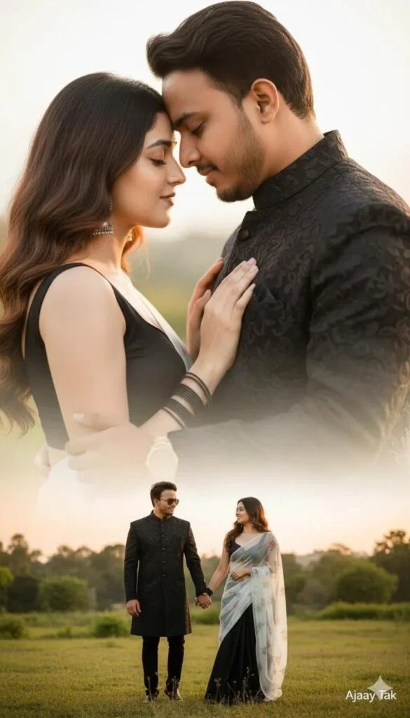 A hyper-realistic 8K cinematic DSLR double exposure portrait of a couple. Use the exact faces from the reference photo, do not alter their faces in any way. The primary close-up shows the couple forehead to forehead, eyes closed, in a soft romantic embrace. The man has a beard and wears a black patterned sherwani jacket, while the woman wears a black outfit with elegant bangles. Her hand rests on his chest, highlighting a wristwatch. The secondary exposure shows both of themstanding #couple
