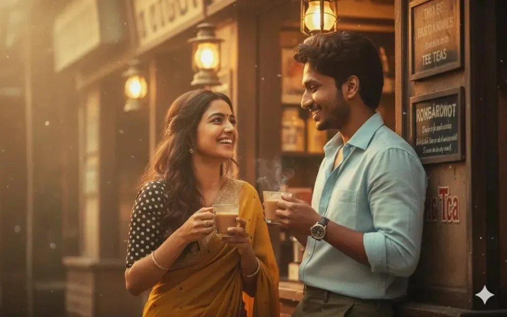 New couple Photo prompts is hereAn intimate editorial-style shot of a couple outside a vintage tea shop with old signboards and dim lantern lights. Both are holding hot tea glasses, laughing and chatting as if caught in a candid moment. The girl (uploaded girl face) wears a retro saree in mustard yellow with a polka-dot blouse, her wavy curls glowing in soft light. The guy (your face) leans casually againstthe shopfront in a pastel shirt, smiling at her. 1/2