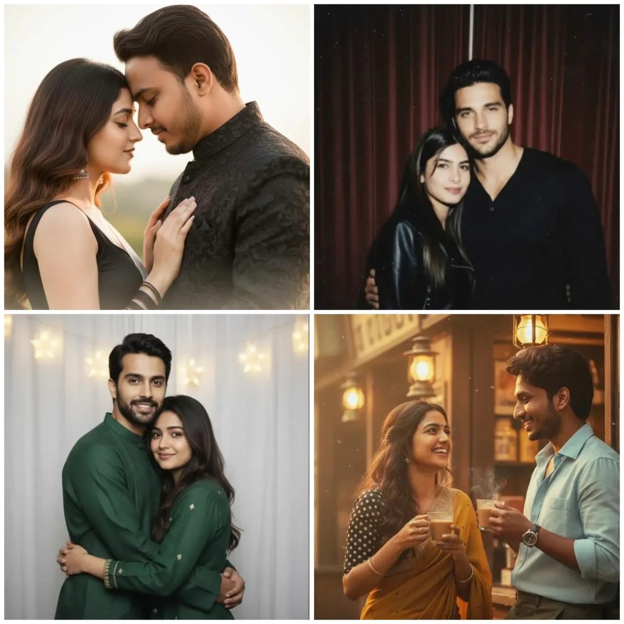 New couple Photo prompts is hereAn intimate editorial-style shot of a couple outside a vintage tea shop with old signboards and dim lantern lights. Both are holding hot tea glasses, laughing and chatting as if caught in a candid moment. The girl (uploaded girl face) wears a retro saree in mustard yellow with a polka-dot blouse, her wavy curls glowing in soft light. The guy (your face) leans casually againstthe shopfront in a pastel shirt, smiling at her. 1/2